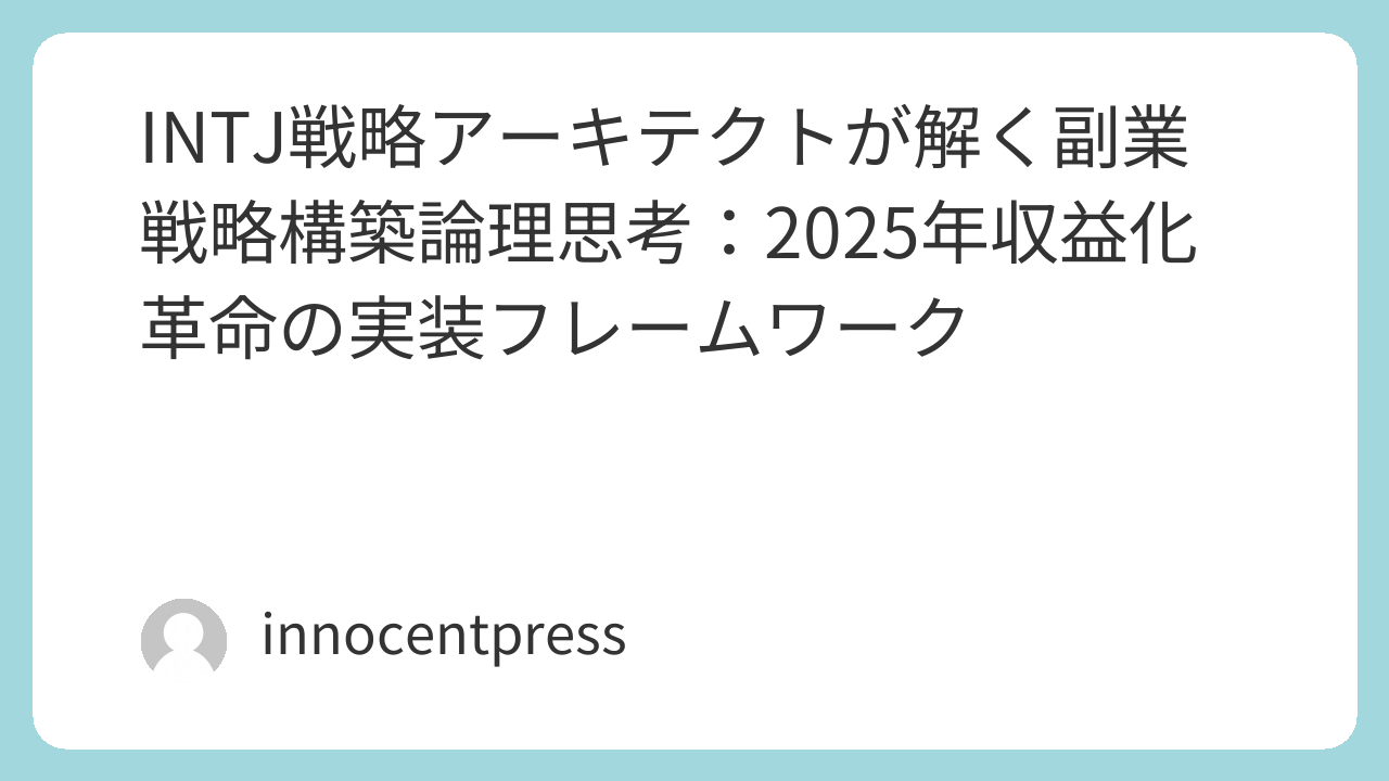 INTJ戦略アーキテクトの視点から分析すると、副業戦略構築論理思考は内向的直観(Ni)による本質的洞察と外向的思考(Te)による論理的実装の最適な融合を実現する。2025年の技術環境において、データドリブン分析、AI支援戦略設計、リアルタイム市場適応の統合により、従来不可能だった高精度な収益化戦略が実現可能となっている。本稿では、この変革期における個人の経済的自立と価値創出を目的とした、体系的な副業戦略構築論理思考の実装フレームワークを展開していく。