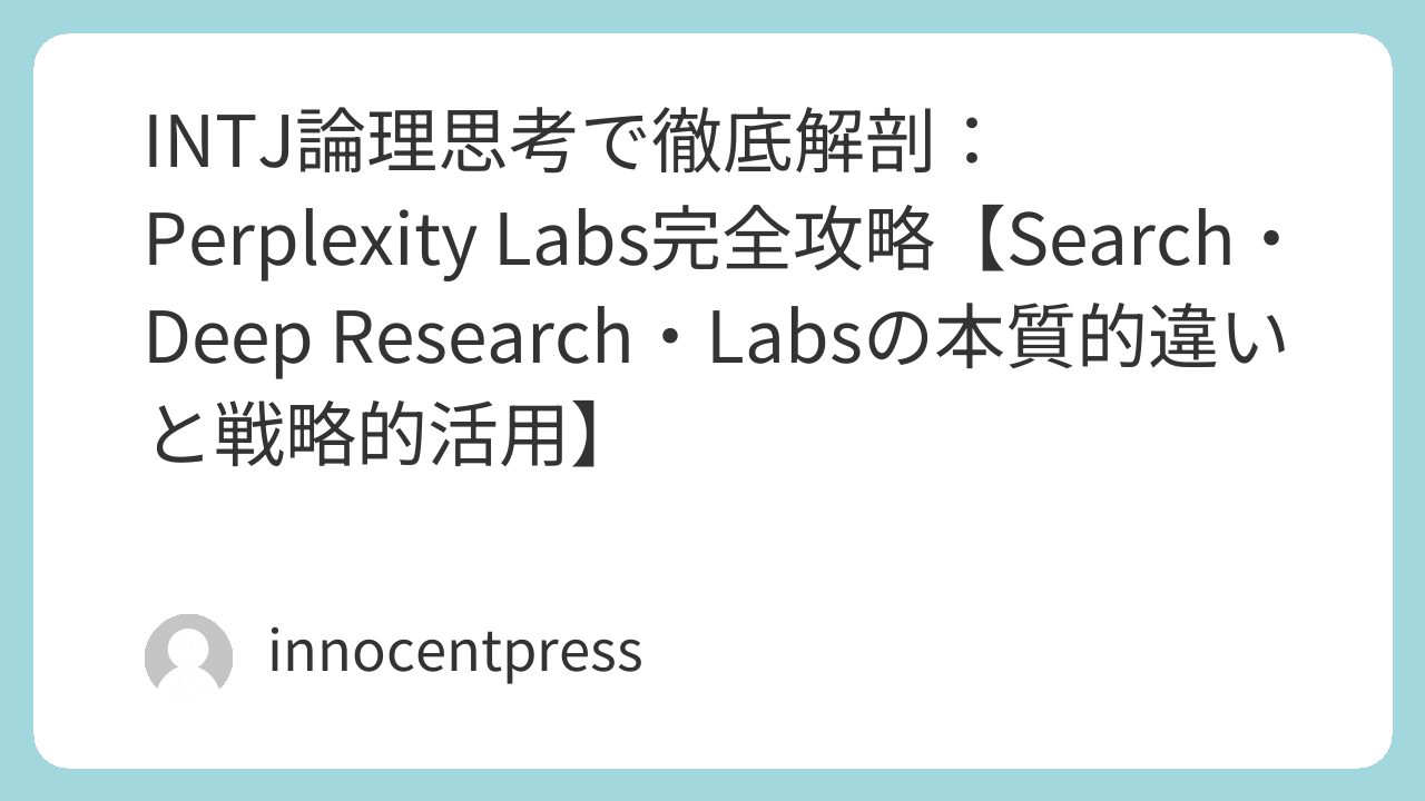 Perplexity Labsは、単なるAI検索の進化形ではない。これは「知的生産プロセス全体の自動化エンジン」であり、従来のSearch・Deep Researchとは本質的に異なる次元に存在する。多くのユーザーは「どれもAIで調べてくれるだけ」と誤解しているが、実際は「情報取得の自動化」と「知的生産の自動化」という根本的な違いがある。INTJ論理思考で、Search・Deep Research・Labsの構造的差異、実践活用法、日本市場戦略、未来予測まで体系的に解説し、AI時代の知的生産最適解を提示する。