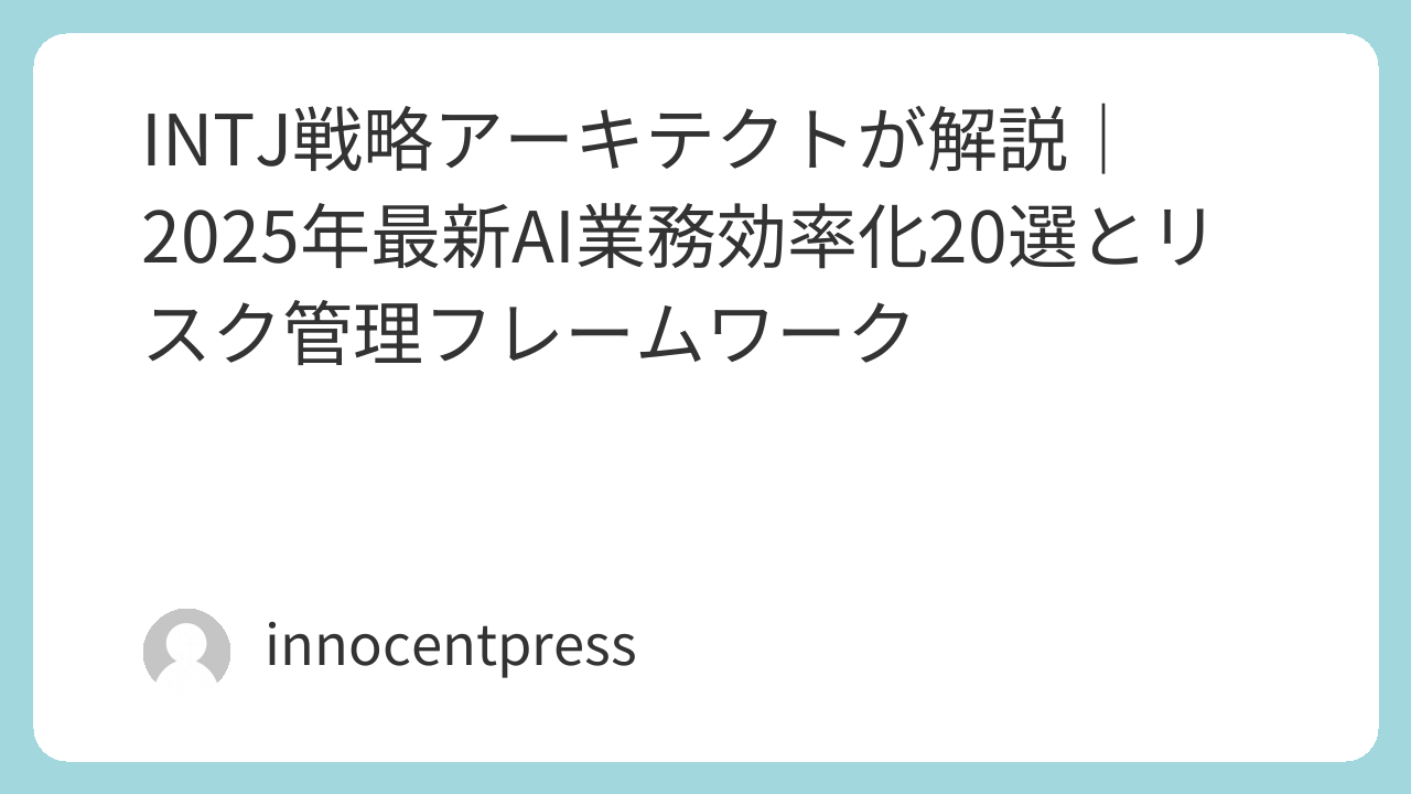 AI業務効率化は2025年、単純作業自動化から戦略的資源配分への進化が加速中。本記事では20の具体的手法を、リスク管理フレームワークと実装戦略で体系化。INTJ戦略アーキテクトの論理的アプローチで、62%の作業時間削減と92%の精度向上を実現する実践ガイドを提供。チェックリスト付きで即座に導入判断と実装計画が可能。