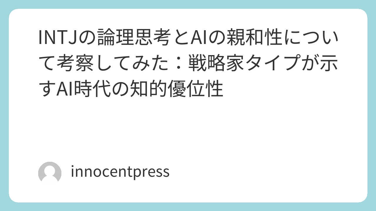 INTJの論理思考とAIの親和性は、単なる「相性の良さ」を超えた**認知プロセスの構造的同一性**に根ざしている。Ni-Te機能連携による「抽象化→論理分析→戦略実装」のサイクルは、AIの学習・推論・最適化プロセスと本質的に合致する。重要なのは、この親和性を戦略的に活用しつつ、人間固有の価値創造・問題設定能力を維持することである。AI時代の知的優位性は、機械との競争ではなく協働にある。