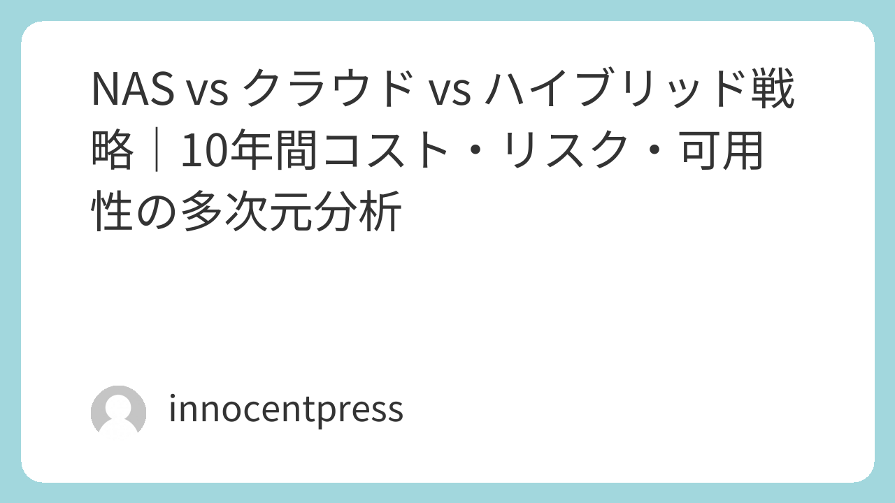 本記事では、INTJ認知機能(Ni-Te)による長期最適化設計と確率論的リスク評価を用いて、10年間の総所有コスト(TCO)・データ損失リスク・システム可用性を多次元分析します。単なるコスト比較ではなく、データ容量増加率・アクセスパターン・災害発生確率・技術進化シナリオを統合した戦略的意思決定フレームワークを提示します。この分析により、個人・家庭・小規模法人が「どの容量からハイブリッドが有利か」「リスク分散の定量的効果」を論理的に判断できます。