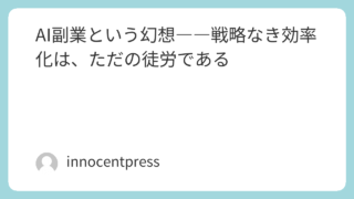 論理的コラム AI副業という幻想――戦略なき効率化は、ただの徒労である AI副業で多くの人が陥る落とし穴は「戦略の不在」。生成AIでコンテンツを作れば稼げるという幻想が失敗を招く。本記事では10時間を1時間に短縮する真の意味と、AIと人間の最適分業、収益化に必要な戦略的思考をINTJ型認知フレームで解説します。【2025年最新版】 2025.10.09 論理的コラム