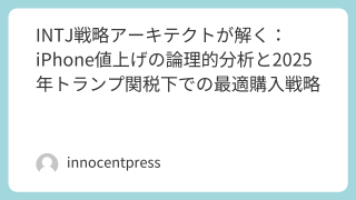 テクノロジー動向 INTJ戦略アーキテクトが解く:iPhone値上げの論理的分析と2025年トランプ関税下での最適購入戦略 INTJ戦略アーキテクトがiPhone17値上げを論理分析。トランプ関税、技術革新、価格予測を網羅。2025年の最適購入タイミングと代替選択肢をFAQ付きで解説。投資判断に必要な全情報を提供。 2025.06.05 テクノロジー動向